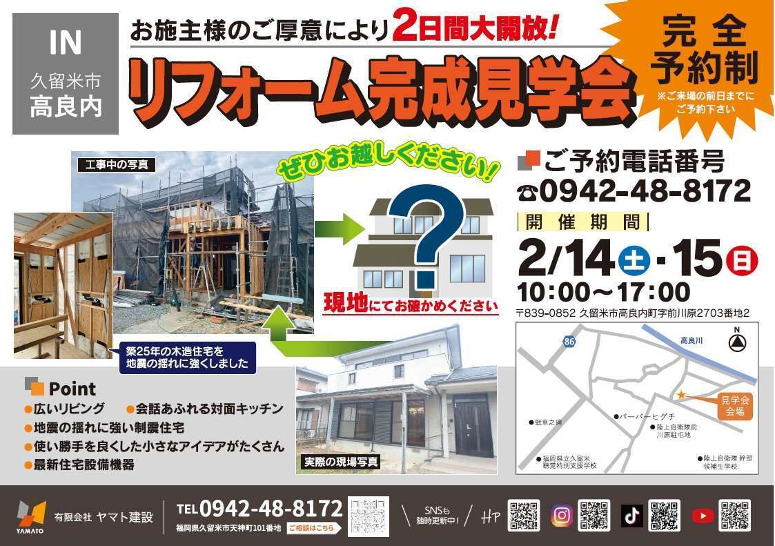 2月14日(土)15日(日)は、久留米市高良内町にてリノベーション完成見学会を開催いたします。当日の電話予約も可能です。